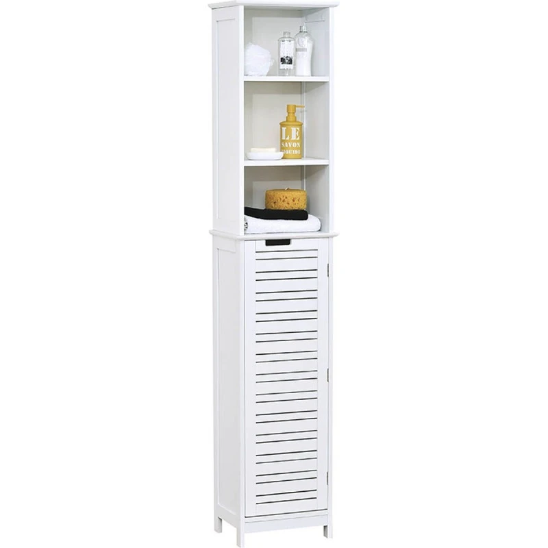 Cette colonne salle de bain blanche à la fois pratique et aux dernières tendances apportera des espaces de rangement supplémentaires dans votre salle de bain. 1 porte avec 2 étagères intérieures. 3 niches. Découpe-poignées très design. En panneaux épais de fibres de bois (MDF), 15 mm.