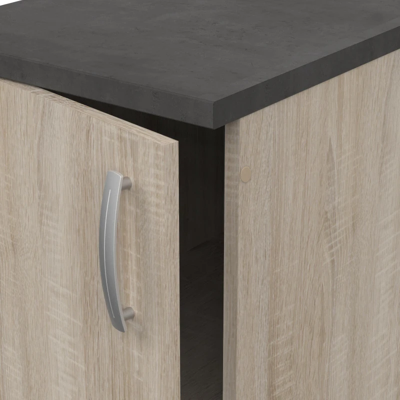 Le coloris chĂȘne brossĂ© s’accorde parfaitement avec le plan de travail coloris gris bĂ©ton.Â