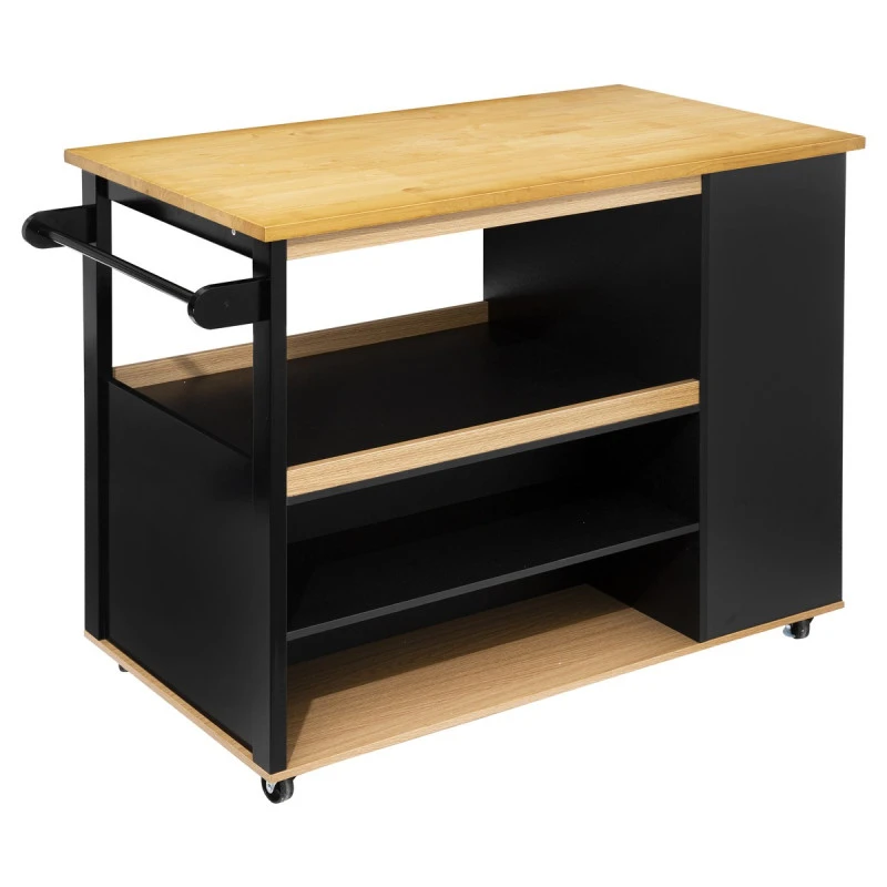 Envie d’un ilot central dans votre cuisine ? Cet ilot sur roulettes en coloris noir et naturel sera idĂ©al dans une cuisine moderne.